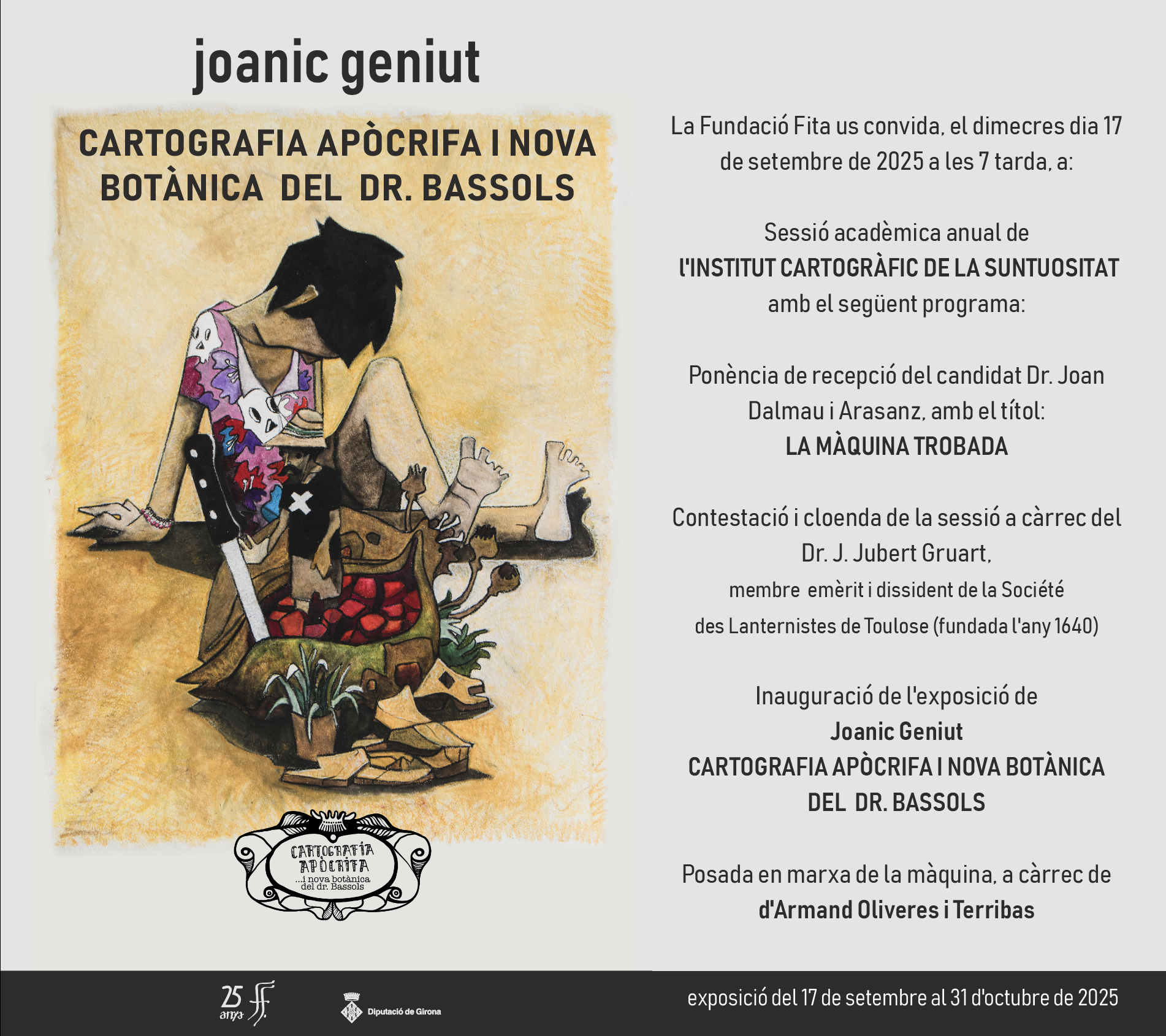 Acompanya a la sessió acadèmica una exposició dels dibuixos de Joanic Geniüt fets amb motiu d'aquesta presentació. Podreu veure l'exposició del 17 de setembre al 31 d'octubre de 2025 a la sala Fundació Fita. Del 23 de setembre al 3 d'octubre la mostra s'ampliarà també amb altres obres a la sala Domènec Fita.